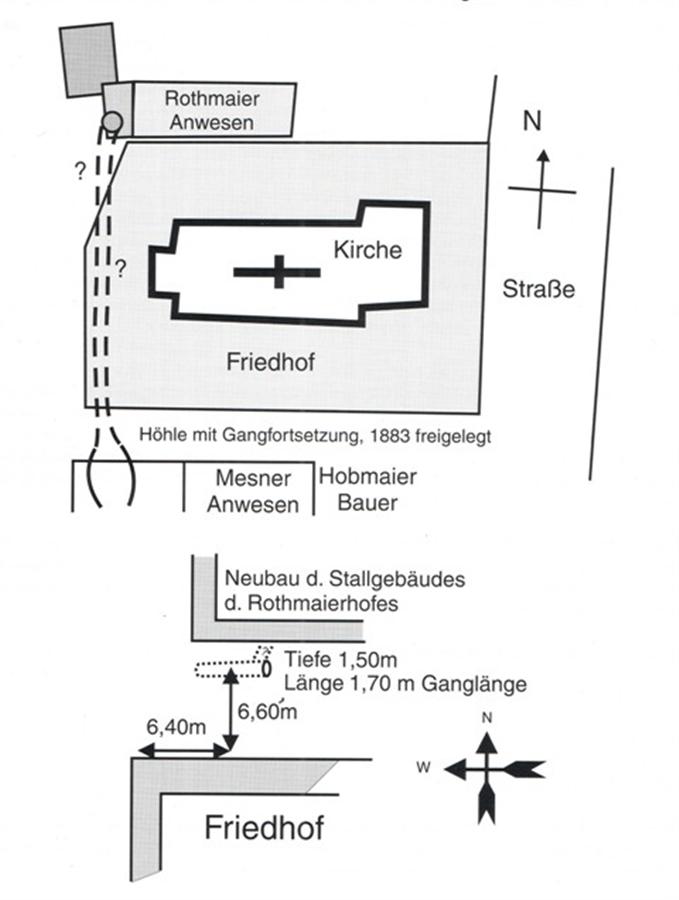 Weiter beschreibt Wenzl den Gang: Der Gang ist in seinen vordersten 4m etwas erweitert um hier Kartoffeln zu lagern. 2,50m von seinem vorderen Eingang entfernt sind rechts senkrecht ein Seitengang von 3,20m Länge, der hinten mit einer Nische geendigt zu haben scheint. Der Hauptgang hat, von vorn gemessen, eine Länge von 9m, ist größtenteils eingefallen und in seinem obersten Teil nur knapp noch schlüpfbar. An seinem Ende sind 2 Seitennischen angedeutet, Richtung WNW. Die Breite des schlüpfbaren Teils ist nur 45cm. Vorn ist er weiter. Merkwürdig sind viele „Luftlöcher“ von etwa 10-15cm Durchmesser, manche auch nur 5cm, Röhren, die in den losen Sand gearbeitet sind und teilweise mit einem Maßstab bis zu 1,40m verfolgbar sind. Der Gang hat oben beim Sellmaier seine Fortsetzung gehabt. Hier wurde beim Ausschaten einer Kalkgrube der Gang angestochen und nach beiden Seiten eine kleine Strecke weit von den Leuten verfolgt. Er soll hier so hoch gewesen sein, dass er begangen werden konnte. Er war auch spitzbogig gewölbt und windet sich genau in der Richtung gegen die KIrche (senkrecht gegen die Strasse). In der Nähe des Knies steht ein Backhaus des Sellmaier Bauern. Hier war auch schon in früheren Jahren ein Loch im Boden, in welches das Wasser geschüttet wurde, mittels welchem die Kohlen gelöscht wurden. Das Wasser verschwand regelmäßig in dem Loch, welches offenbar auch eine Fortsetzung des Gangs war. Der Gang verlief ungefähr 14 m von der Strasse entfernt.
