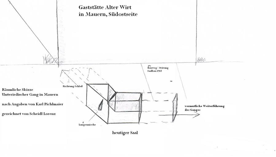 Den zunächst dürftigen Hinweisen bei den Recherchen zu dem Erdstall in der Schupfloh ist es zu verdanken, dass ein weiterer unterirdischer Gang im Ortskern erst „entdeckt“ werden konnte. So wusste Herr Hundseder, der das ehemalige Jagdhaus bewohnt, zu berichten, dass angeblich ein unterirdischer Gang vom Schloss Mauern nach Isareck führen solle. Dieser wäre auch schon angegraben worden. Seine Frau machte detaillierte Angaben zur Lage eines Gangstückes, das bei Bauarbeiten angebaggert wurde. Es führte von der Südseite des Wirtschaftsgebäudes des Pfarrhofes in Richtung Pfarracker. Der Dorfchronist, Erwin Braun wusste von einem angegrabenen Gangstück während des Saalbaus beim Alten Wirt 1965. Auf Nachfrage bei Karl Pichlmaier, dem Wirt, machte dieser sehr detaillierte Angaben und fertigte eine kleine Skizze. Der Gang kam aus Richtung Wirtshaus, also vom Schlossareal her, machte dann einen scharfen Knick nach Nordost und war dort von der Bauzufahrt zum heutigen Saal bereits verschüttet. Der Gang hatte etwa 1,50 m Breite auf 1,60 m Höhe und in der Hinterwand befand sich eine exakt gearbeitete Lampennische. Insgesamt fiel im damals die absolut exakte Bauweise des Ganges auf. Es gibt auch Hinweise auf ein weiteres Gangstück, das evtl. vom alten Rübenkeller in der Schmiedgasse, über den Pfarrkindergarten, weiter in Richtung Pfarrheim führte. Somit ergeben sich sehr viele Hinweise auf einen typischen Erdstall im Ortskern von Mauern. Bei den anstehenden Baumaßnahmen zum Kindergartenneubau des Pfarrkindergartens konnte allerdings kein Hinweis auf weitere Gangstücke gefunden werden. Auch der Rübenkeller besitzt keine Gangforstetzung, was aber nicht heisst, dass im Bereich des Pfarrhofes nicht noch weitere Gangstücke verborgen liegen könnten.