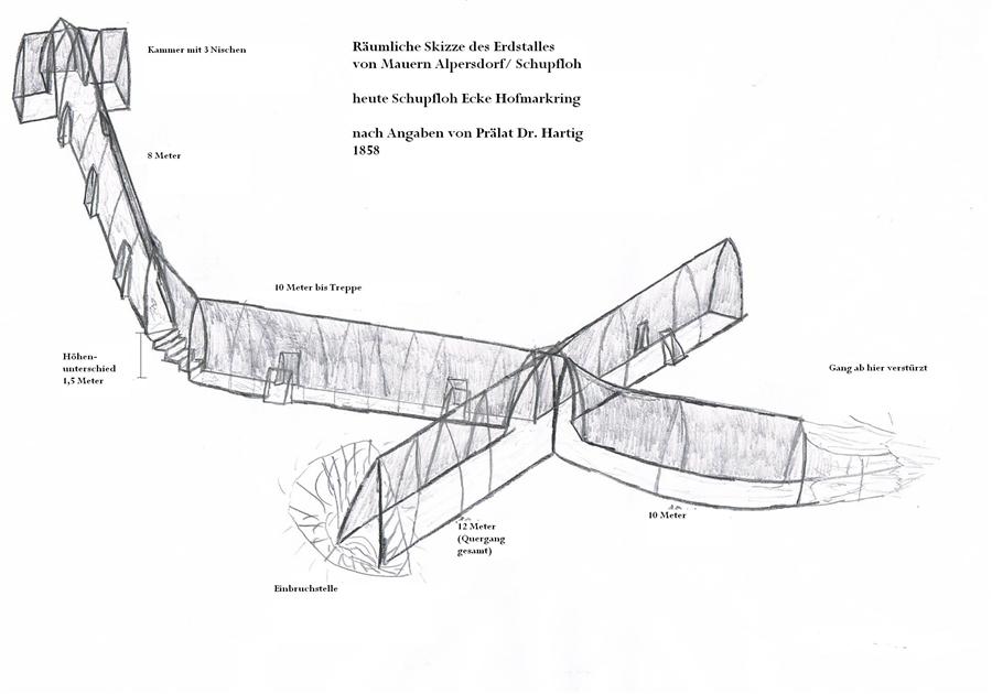 In Mauern berichtete bereits Josef Wenzl über einen unterirdischen Gang, den er wage beschrieb, dessen Lage aber nicht mehr angeben konnte. Nach längeren Recherchen sind nun wertvolle Schriftstücke des damaligen Untersuchers, Pfarrer Thomas Hartig, aufgetaucht. Aus ihnen lässt sich die exakte Lage des Erdstalles angeben und sein Aussehen gut rekonstruieren. Der Erdstall bestand aus einem Hauptgang, der ab Einbruchstelle 12 Meter lang war. Von ihm zweigten zwei Seitengänge ab, von denen einer nach 10 Metern schon zur damaligen Zeit verstürtzt war, der andere aber nach 10 Metern an eine Treppe mündete. Nach der Überwindung von 1,5 Metern Höhenunterschied erreichte man nach etwa 6 Metern eine kleine Halle mit 3 Seitenkammern/ Nischen. Auch Seitennischen, evtl. Lampennischen sind überliefert. Somit handelt es sich hier um einen typischen Erdstall mit seinen charakteristischen Merkmalen. Lediglich Durchschlüpfe sind keine angegeben, was aber nicht heisst, dass es nicht im verstürtzten Teile welche gabe, oder aber sie einfach damals nicht als solche erkannt oder dokumentiert wurden. Die Ermittlung der genauen Lage war zunächst schwierig, da nur von der Nähe zu einer Ziegelei gesprochen wurde und sich die Nachforschungen zunächst auf die Ziegelei in der heutigen Hochfeldstrasse/ Ziegelfeld konzentrierten. Eine Skizze in den Unterlagen aus dem historischen Atlas von Ohlenschlager brachten dann den entscheidenden Hinweis auf eine weitere Ziegelei in der Schupfloh. der Flurname allein weist bereits auf einen Erdstall hin. Die Flurstücke aus dem Atlas decken sich mit Äckern auf moderneren Karten und somit kann die Lage des Erdstalles sehr genau mit der heutigen Schupfloh, Ecke Hofmarkring angegeben werden. Damit sind wohl leider auch die letzten Reste durch die Baumaßnahmen des Ortsteils Mauern – Alpersdorf zerstört worden. Das Lesen des Heftes „Sagen und Geschichten aus der südlichen Hallertau“ brachte dann noch einen letzten Hinweis auf den Gang zu Tage, nämlich folgende Erzählung: