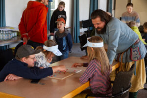 Die Mittelaltergruppe Eisenteufel betreute gleich zwei Stationen. Einmal wurden die Variationen des Würfelns von der Antike bis zur Neuzeit vorgeführt, danach konnten die Kinder selbst spielen. An der zweiten Station durften die Kinder dann Armbänder herstellen und mitnehmen.